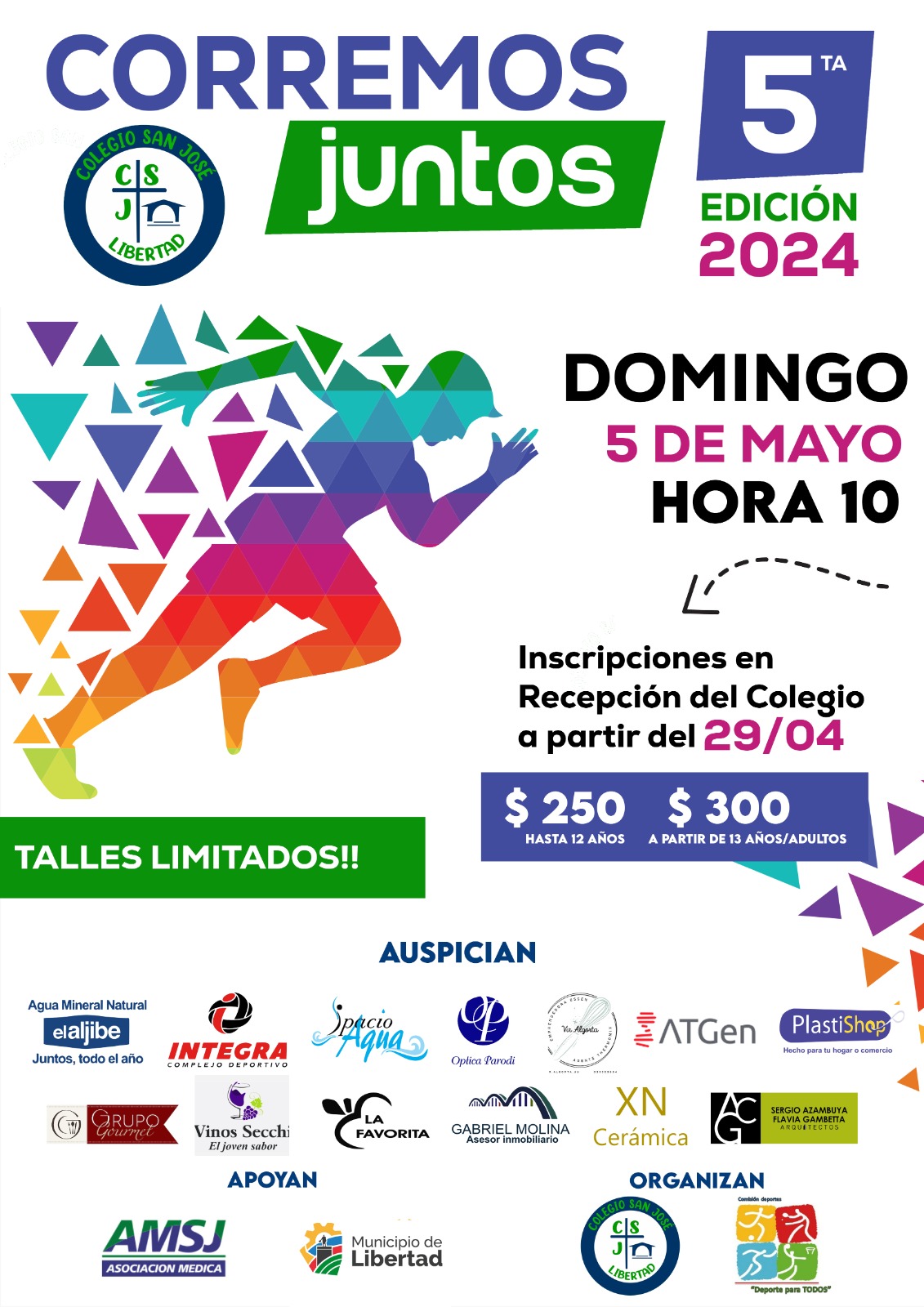 Para ir agendando la fecha y comprando tu camiseta.Domingo 5 de mayo de 2024, hora 10. Inscripciones en la recepción del Colegio desde el 29 de abril.AUSPICIAN: @elaljibe_27 @integra_cd @spacioaqua @opticaparodi @vir.algorta.uy @plastishop_uy @azambuya_gambetta_arq @xn_ceramica @gabrielmolinauy @la_favorita_lib @grupogourmetlibertadAPOYAN: @amsjsanjose @municipiodelibertad